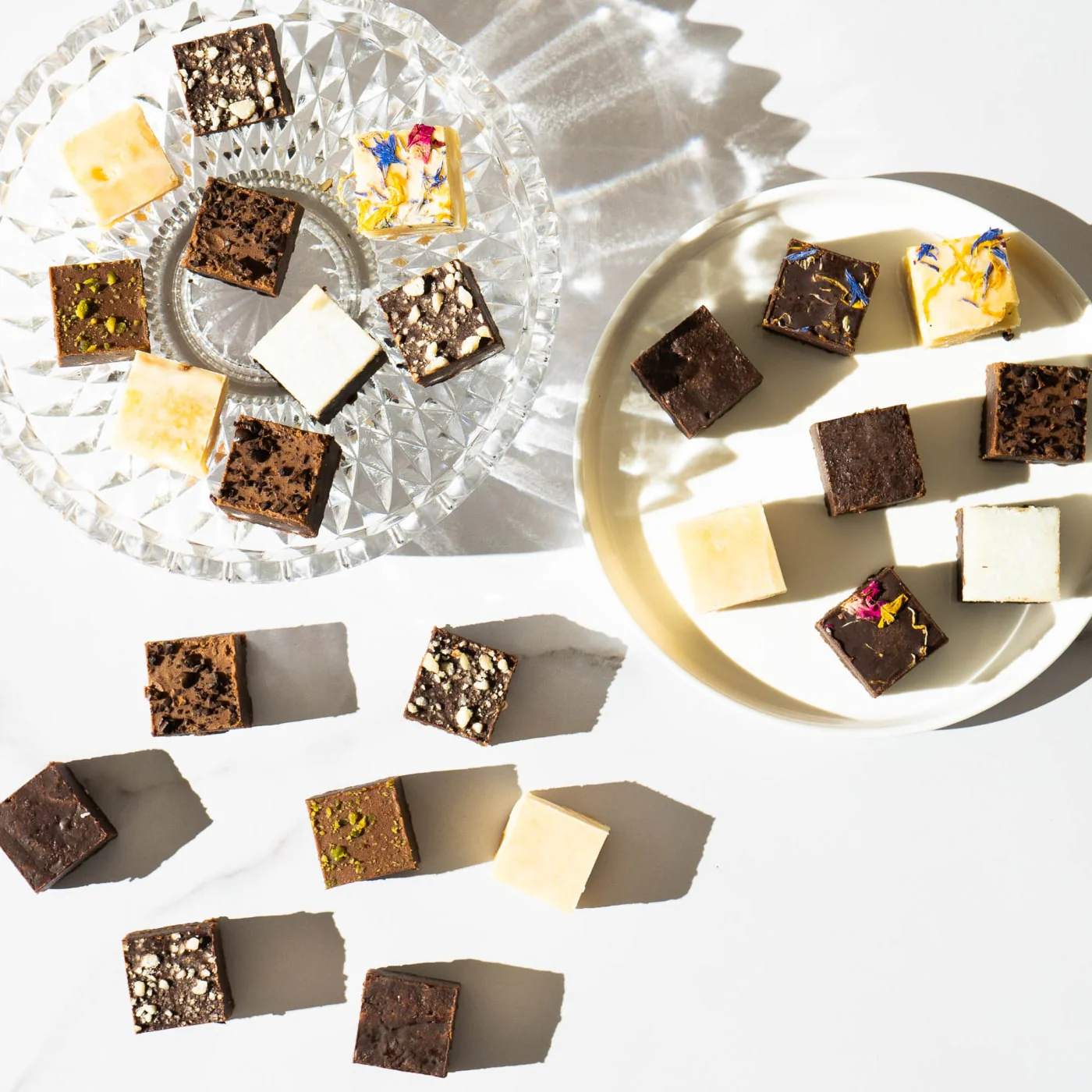 Eine Zusammenstellung verschiedener Brownie in Pralinen-Größe.